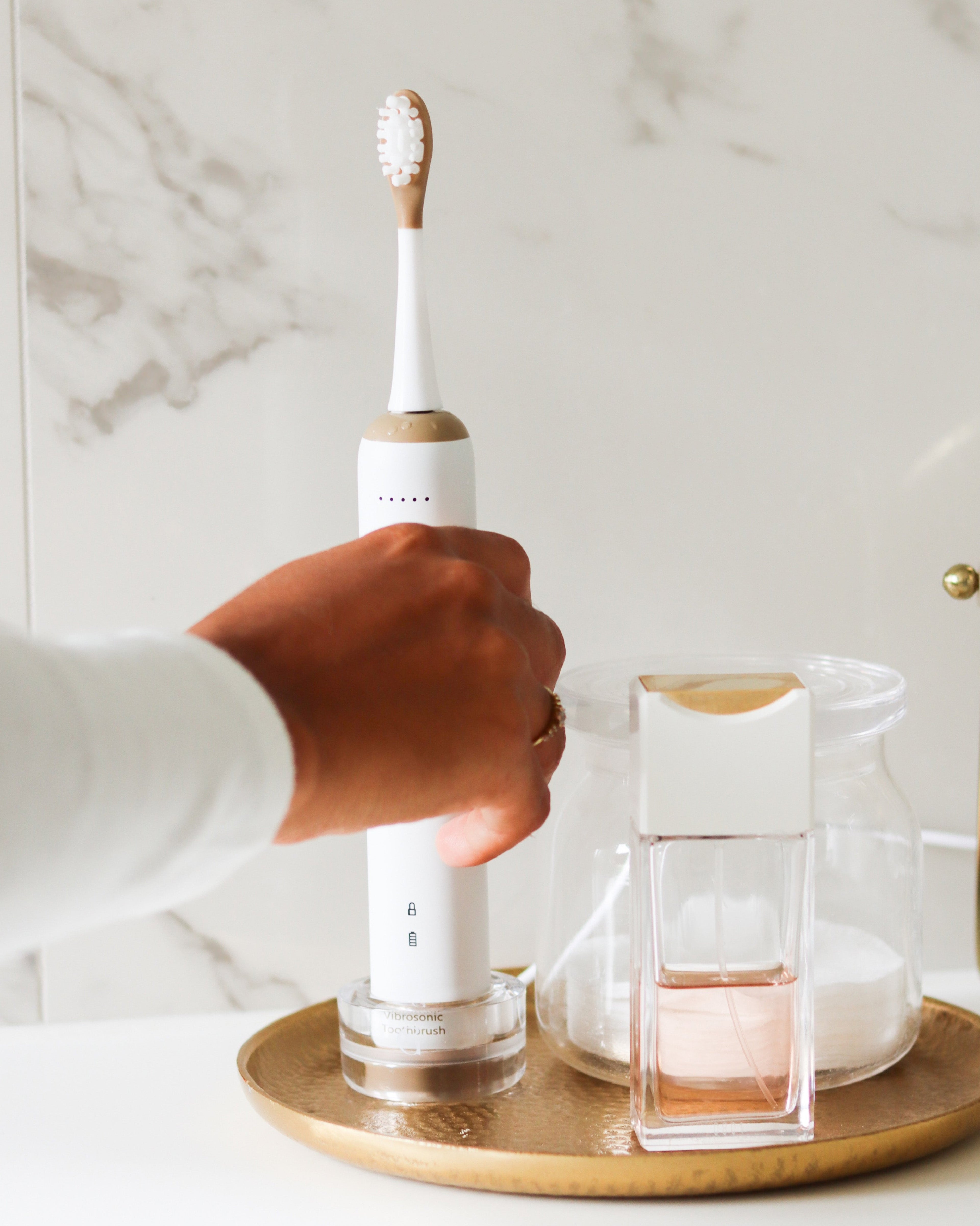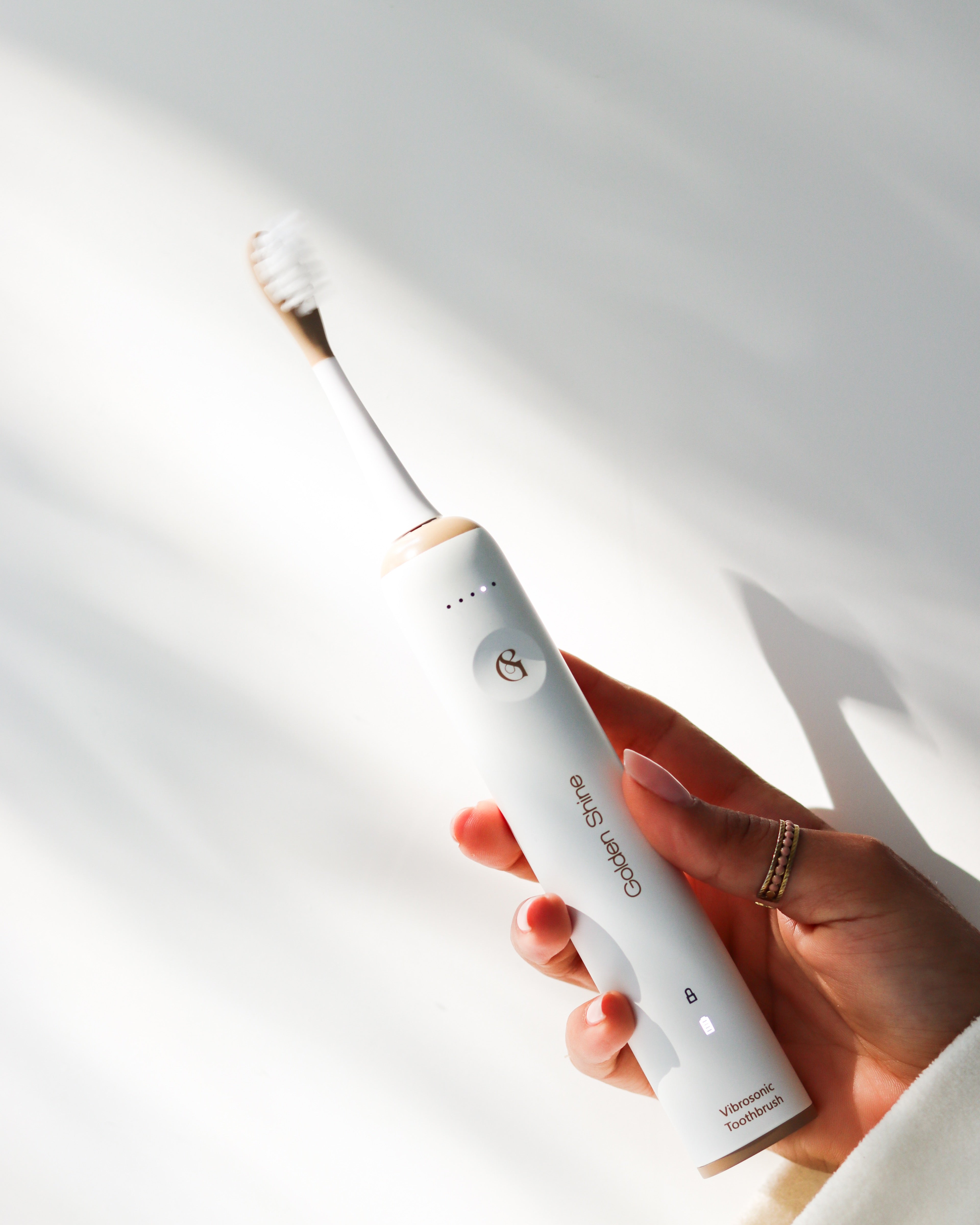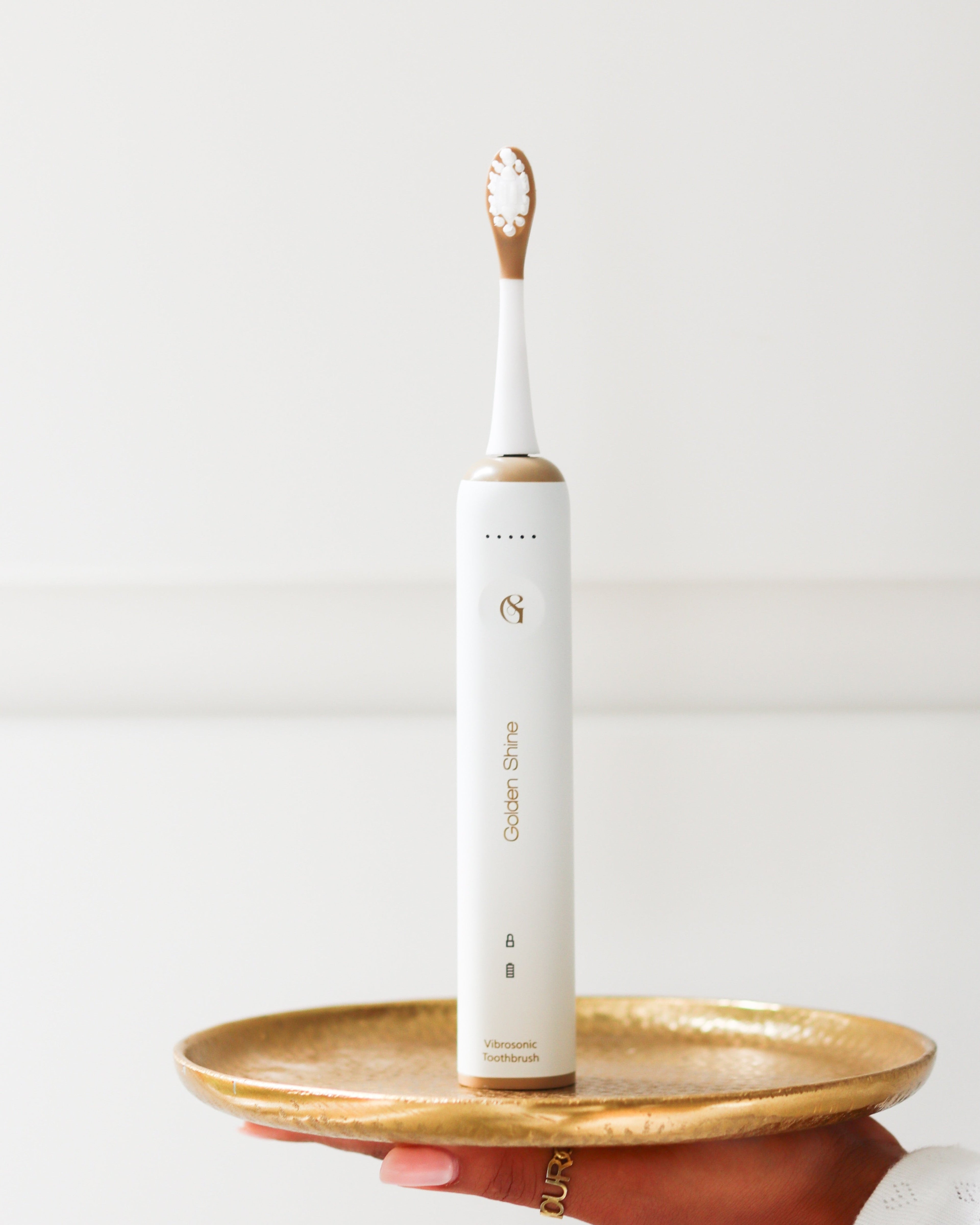 Golden Shine est bien plus qu'une brosse à dents, c'est un véritable bijou technologique qui révolutionne le brossage. Sa technologie Vibrosonic combine vibrations soniques et oscillations verticales, reproduisant fidèlement le geste précis recommandé par les dentistes. Alliant performance clinique et élégance, elle offre à vos dents le soin qu'elles méritent. Un objet du quotidien qui, grâce à son design raffiné, devient un élément à part entière de votre décoration.